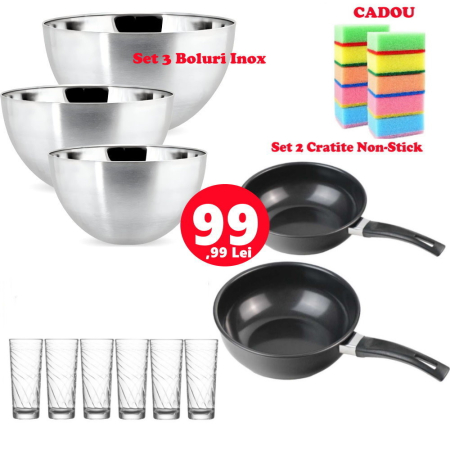 Set Oale Emailate10 Piese,5 Oale cu 5 Capace,Set 6 Boluri sticla sau Set 6 Farfurii sticla, Set Prosoape Pufoase si Ciocan pentru batut carnea