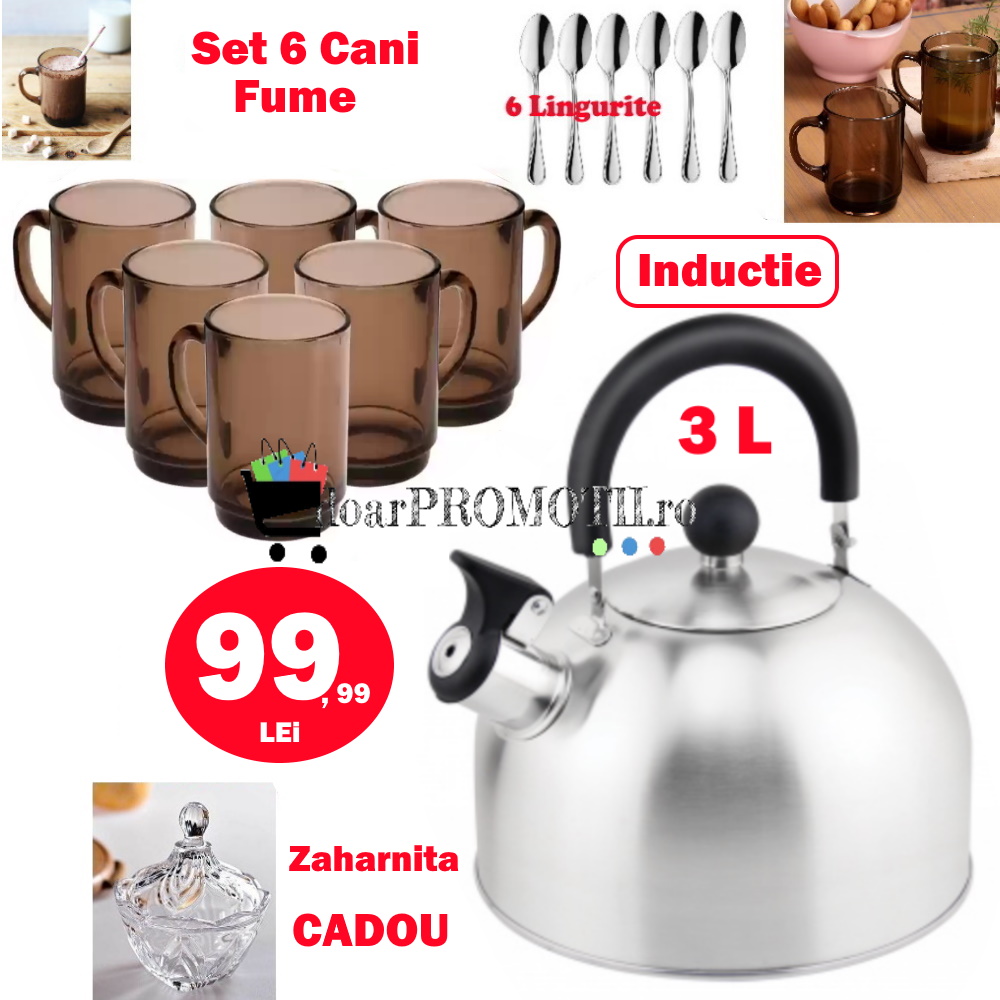 Ceainicul din inox cu fluier are capacitatea de 3L, exterior din otel inoxidabil polishat. Fluierul ceainiciul incepe sa avertizeze atunci cand apa a inceput sa fiarba. Ceainicul se incalzeste rapid datorita materialelor de buna calitate. Ceainicul are o baza cu o marime generoasa pentru un contact mai mare cu elementul de incalzire.