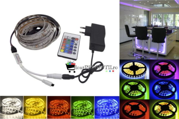 Aceasta banda cu LED-uri RGB are 16 culori selectabile din telecomanda si 4 efecte speciale: