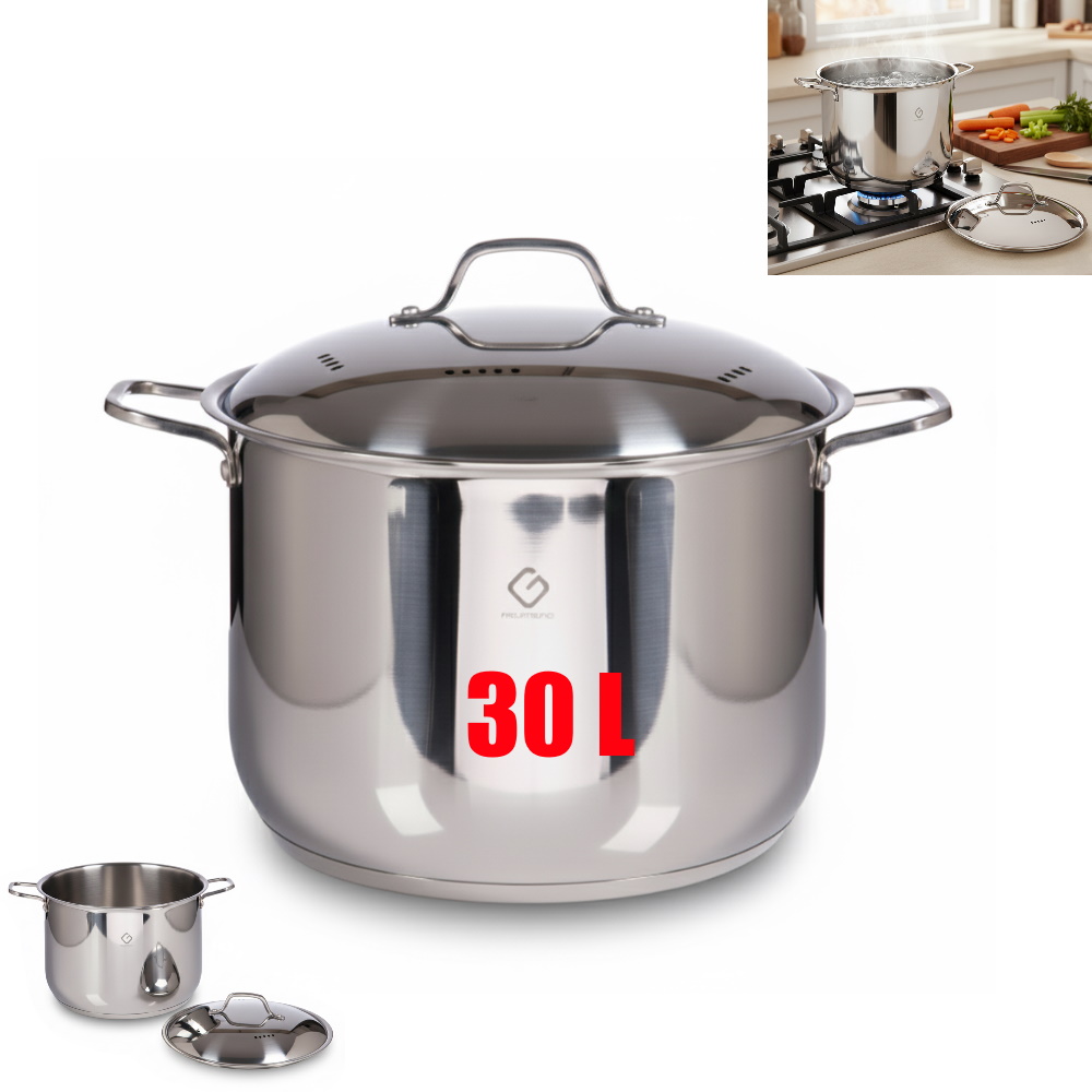 Oalele de la Grunberg sunt fabricate din inox , cu finisaje lucioase , manere nituite si 3 straturi de baza