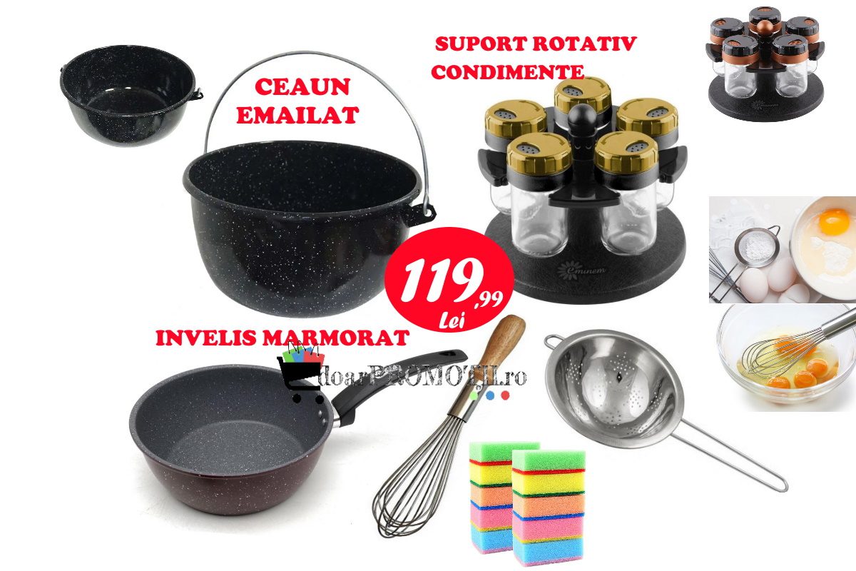 * Pachetul contine ceaun emailat, 2 l, sau cratita cu coada si invelis marmorat, la alegere, in limita stocului disponibil.