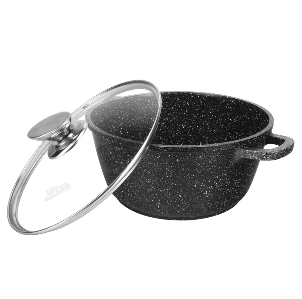 Oala CLASSIC, confectionata din aluminiu turnat si interior cu acoperire ceramica antiaderenta neagra, cu aspect marmorat, face ca produsul sa pastreze caldura o perioada mai mare de timp, reducand considerabil timpul de gatire, cat si consumul de energie. Exteriorul este acoperit de vopsea neagra cu aspect marmorat, rezistenta la temperaturi inalte. Oala vine insotita de un capac de sticla termorezistenta, cu buton din inox.