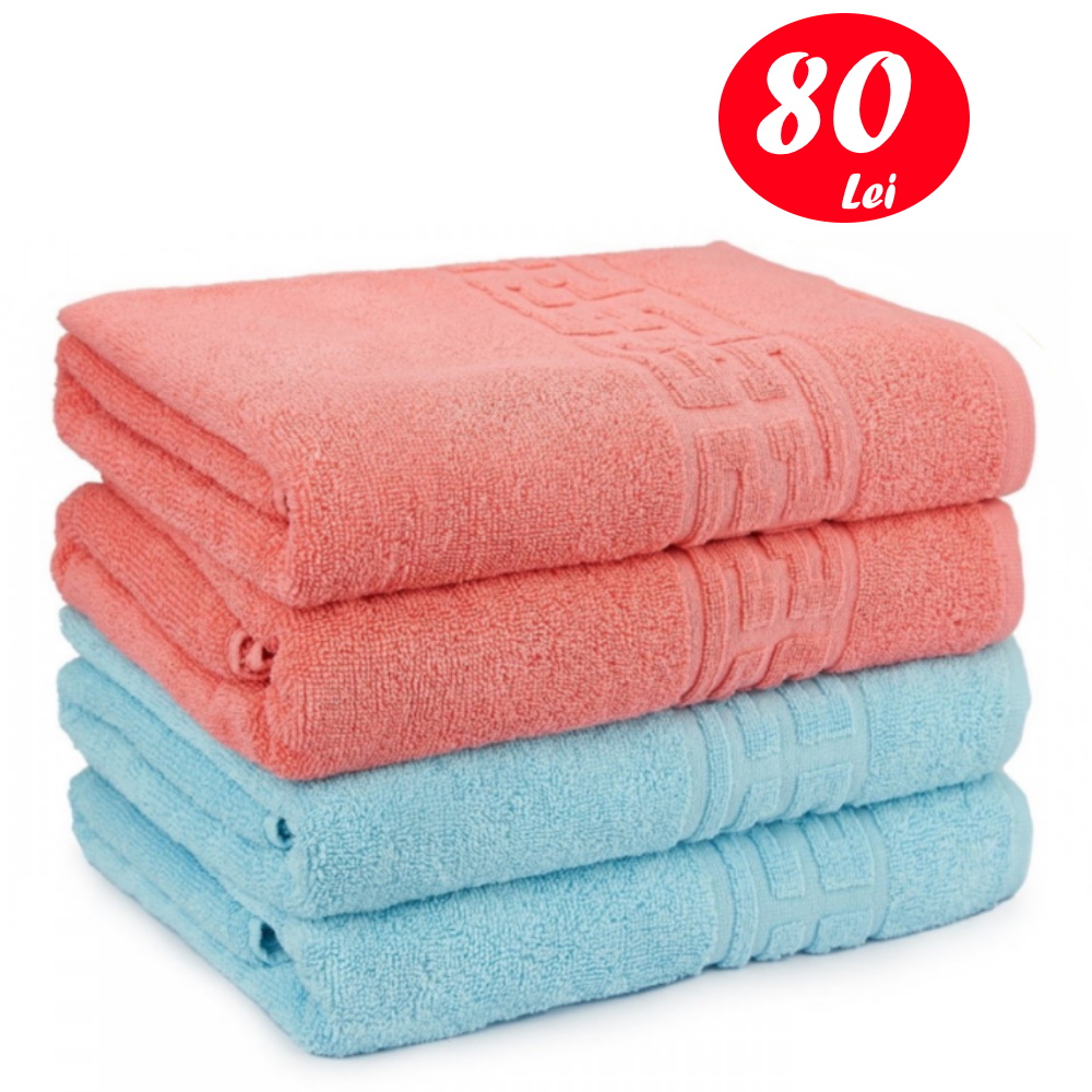 Set 4 prosoape pufoase de baie, regim hotelier cu model bordura greceasca 48×85 cm, Material 100% bumbac, densitate 450 GSM.