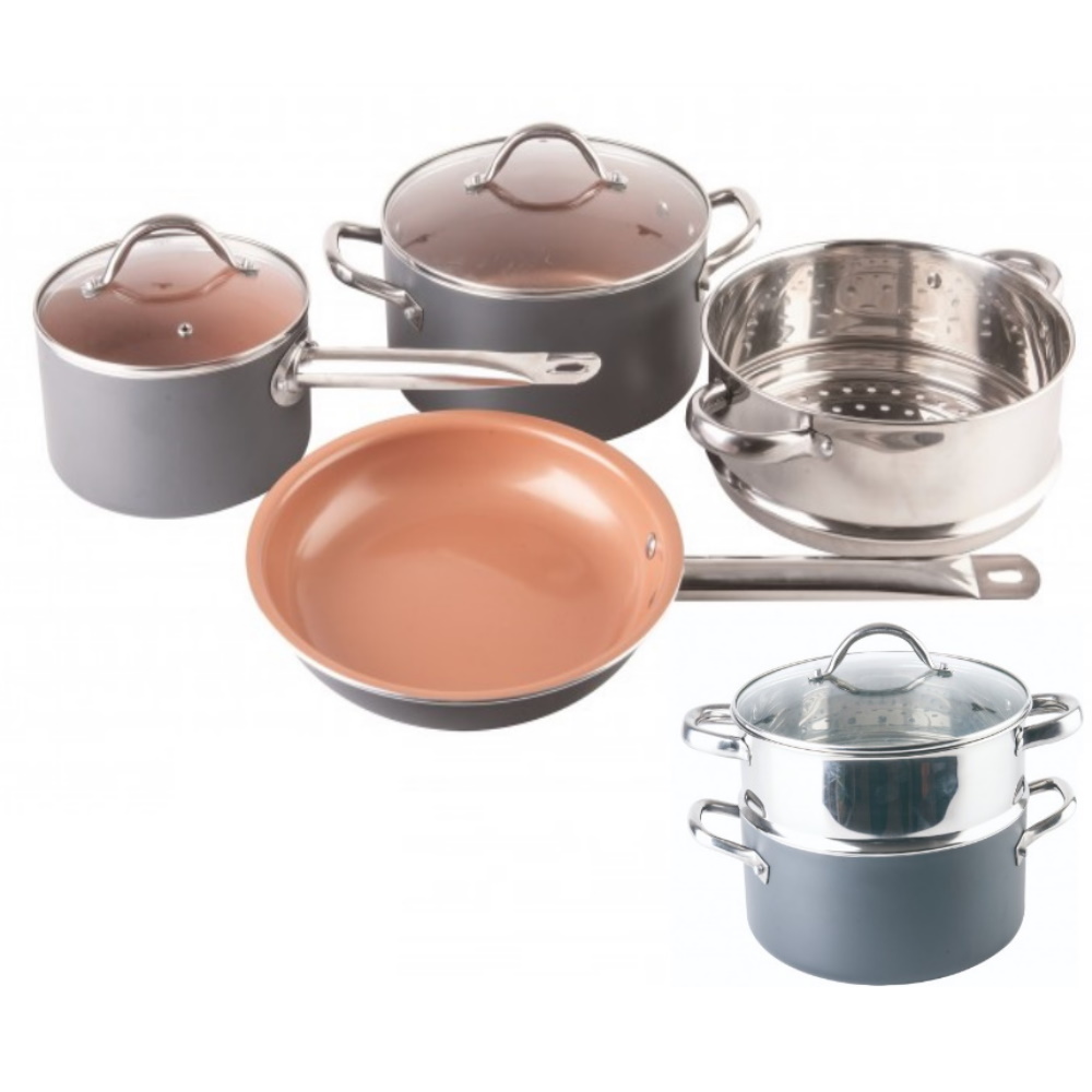 Setul Grunberg contine 3 vase fabricate din aluminiu, cu interiorul acoperit cu material antiaderent cu titan si ceramica, acoperirea exterioara este din material rezistenta la temperaturi ridicate si coroziune.