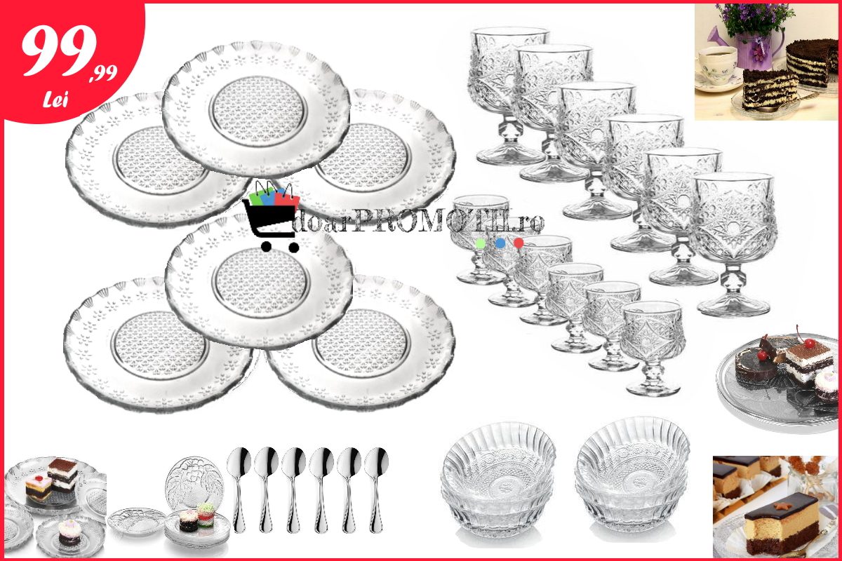 Continut pachet | 6 farfurii desert sticla, 6 boluri sticla, servire desert / fructe, 6 pahare sticla mari, 6 pahare sticlă mici, 6 lingurite desert, diverse sortimente |