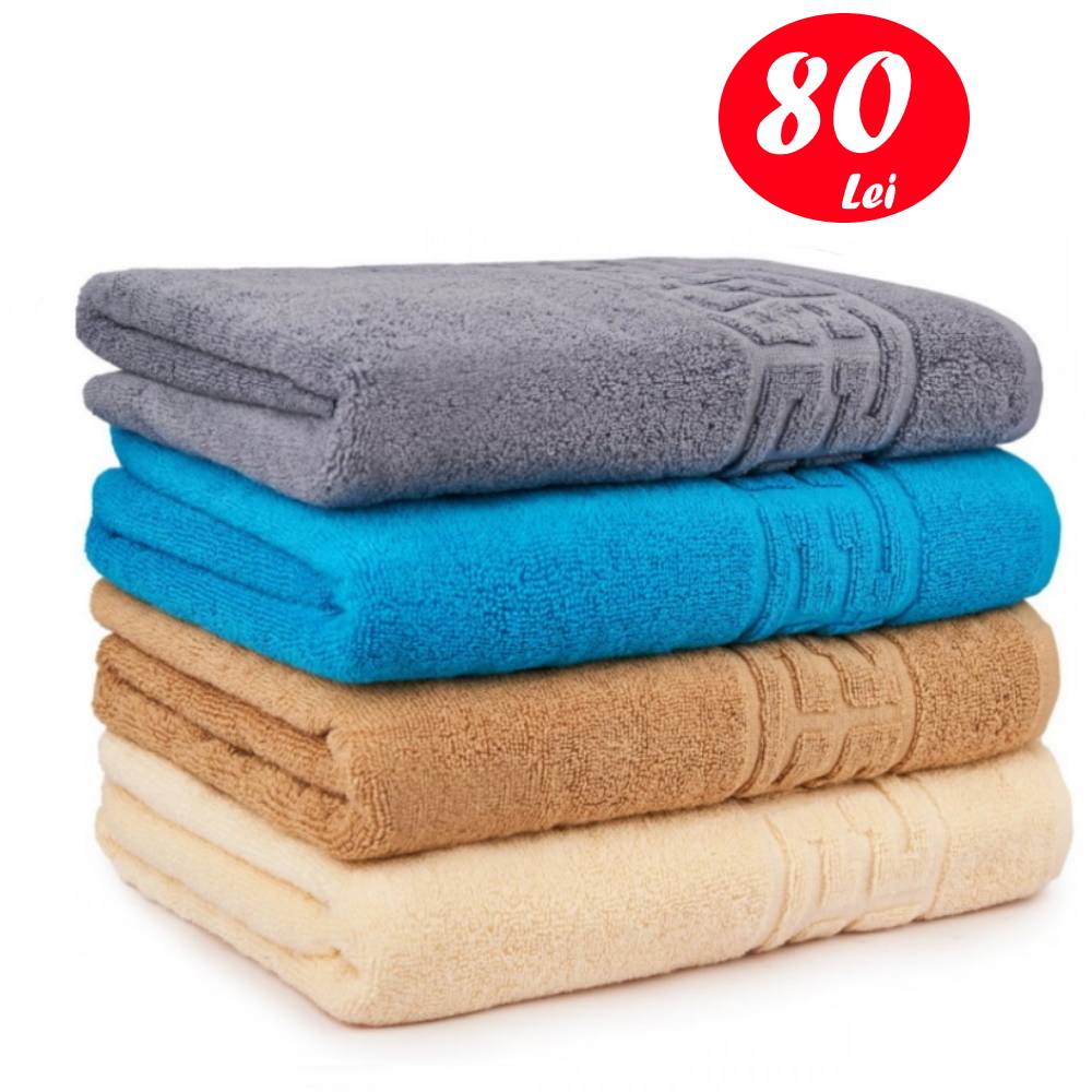 Set 4 prosoape pufoase de baie, regim hotelier cu model bordura greceasca 48×85 cm, Material 100% bumbac, densitate 450 GSM.