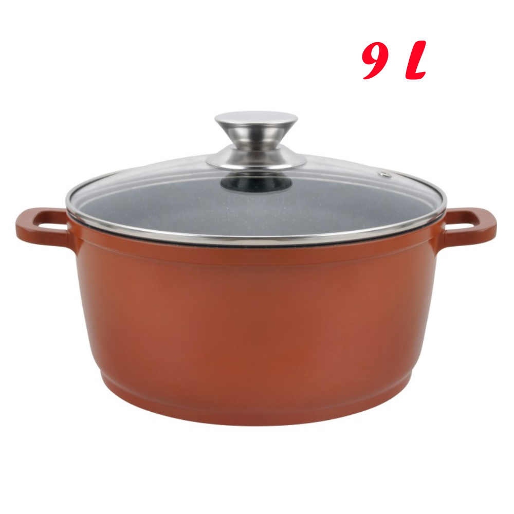Cratita tip tuci din aluminiu cu diametrul 32 cm si capacitate 9 litri, placata cu ceramica marmorata, invelis antiaderent de inalta calitate si capac din sticla termorezistenta.