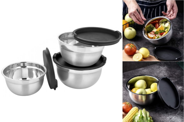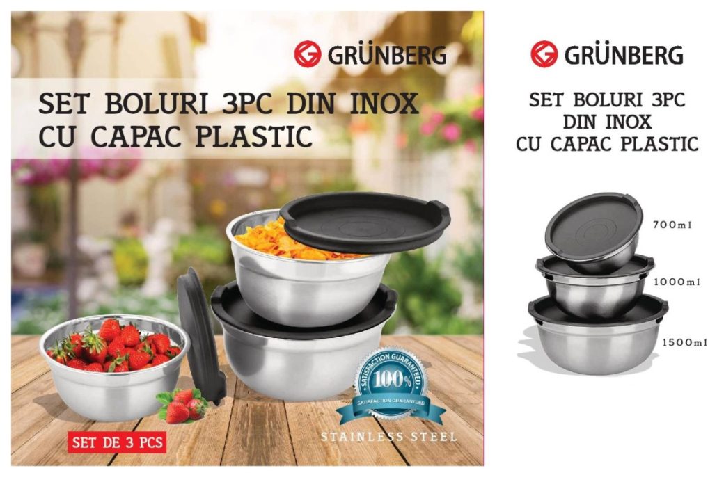 Setul 3 boluri din inox cu capace din plastic , este conceput pentru a pastra si depozita alimentele si preparatele pentru o perioada indelungata.