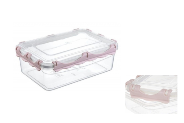 Este realizata din plastic si prevazuta cu clapete pe laturi si garnitura din silicon care ii ofera o inchidere etansa. Forma ei, dreptunghiulara si marginile drepte permit suprapunerea cu alte cutii de depozitare.