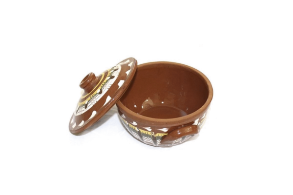 Este o oala din ceramica si lut cu manere, culoare maro, de inalta calitate, cu model rustic.